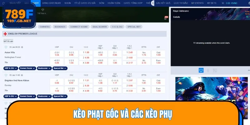 Ngoài các loại kèo chính, thể thao 789F còn mang đến hệ thống kèo phụ vô cùng phong phú như kèo phạt góc, kèo thẻ phạt hay kèo cầu thủ ghi bàn đầu tiên. Kèo phạt góc yêu cầu người chơi dự đoán tổng số lần bóng được đặt ở góc sân hoặc đội nào sẽ thực hiện quả phạt góc đầu tiên trong trận.